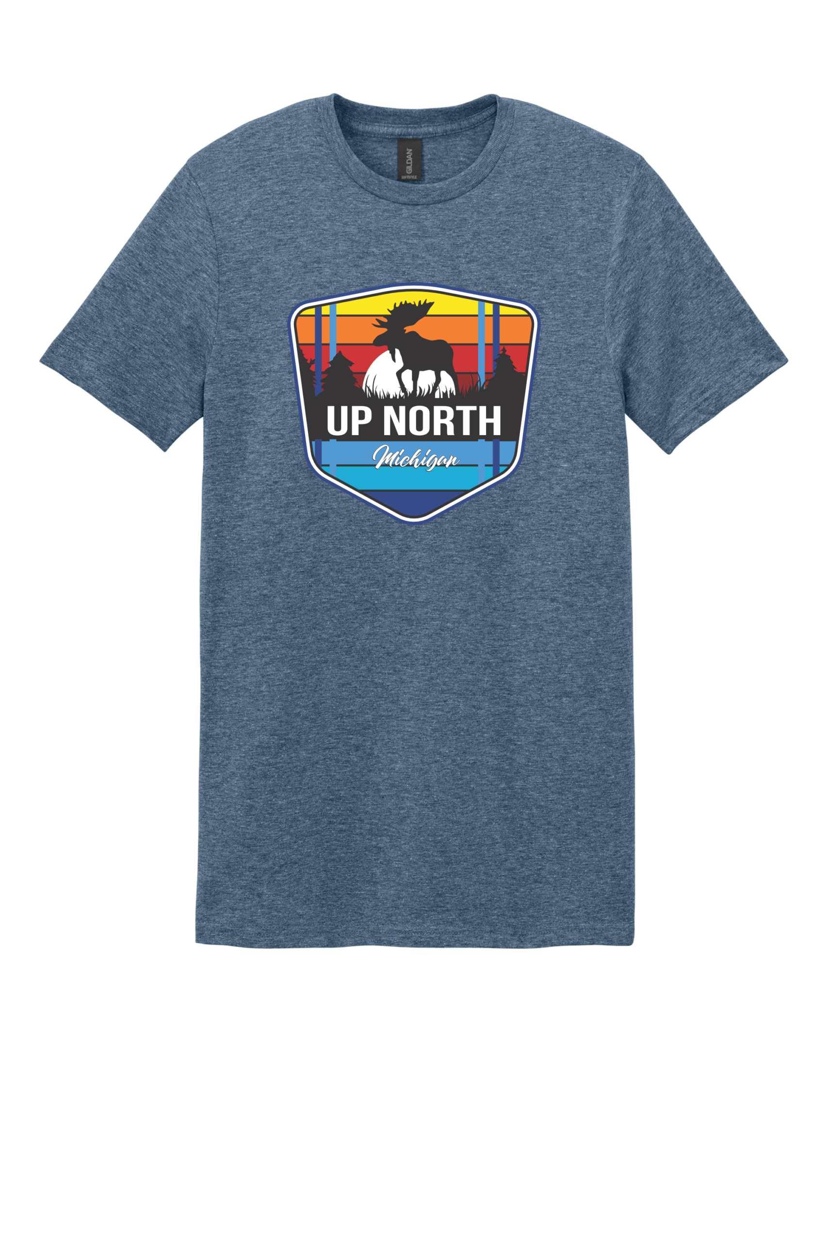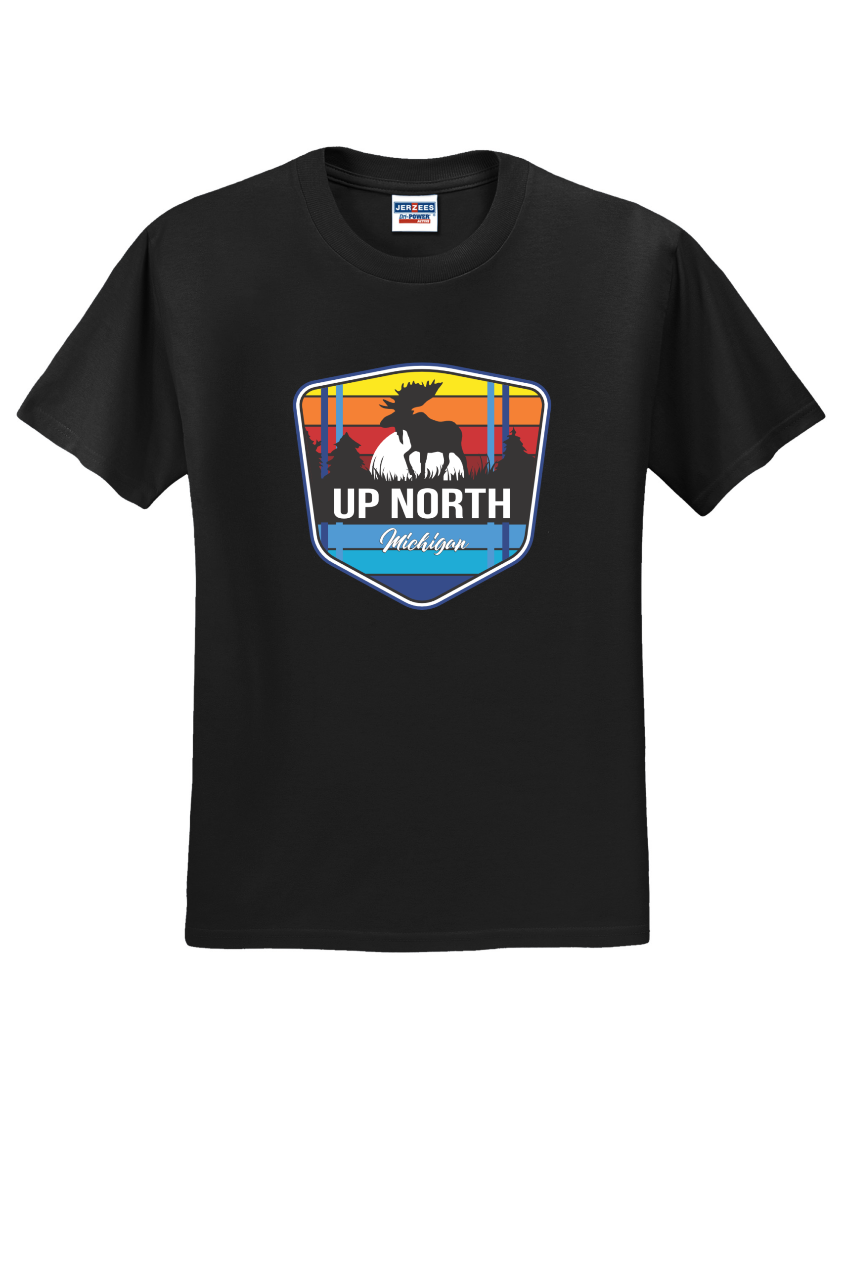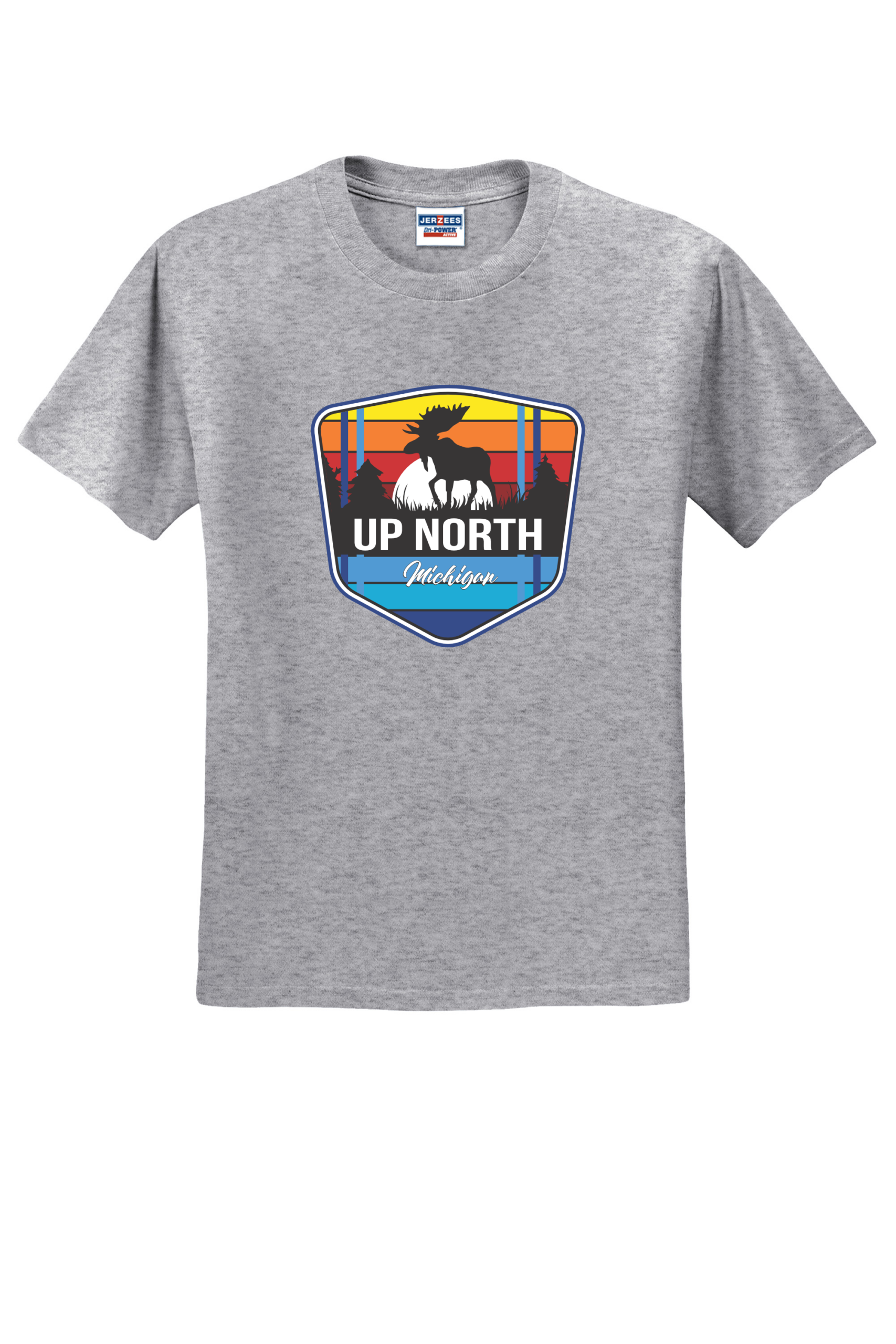 Celebrate Michigan’s wild north with our Up North Moose tee. This vibrant design features a moose silhouette framed by retro sunset stripes and a pine forest backdrop, capturing the beauty and adventure of Northern Michigan. Printed on a premium Jerzees 50/50 shirt for comfort, durability, and everyday wear. Perfect for nature lovers, campers, and anyone who calls “Up North” their happy place. Made from a perfect blend of cotton and polyester, this tee combines comfort and durability with a vibrant, long-lasting print. This shirt ensures your design stands out with brilliant colors and sharp details, making it ideal for any occasion. Make a statement with a T-shirt that’s as stylish as it is comfortable.