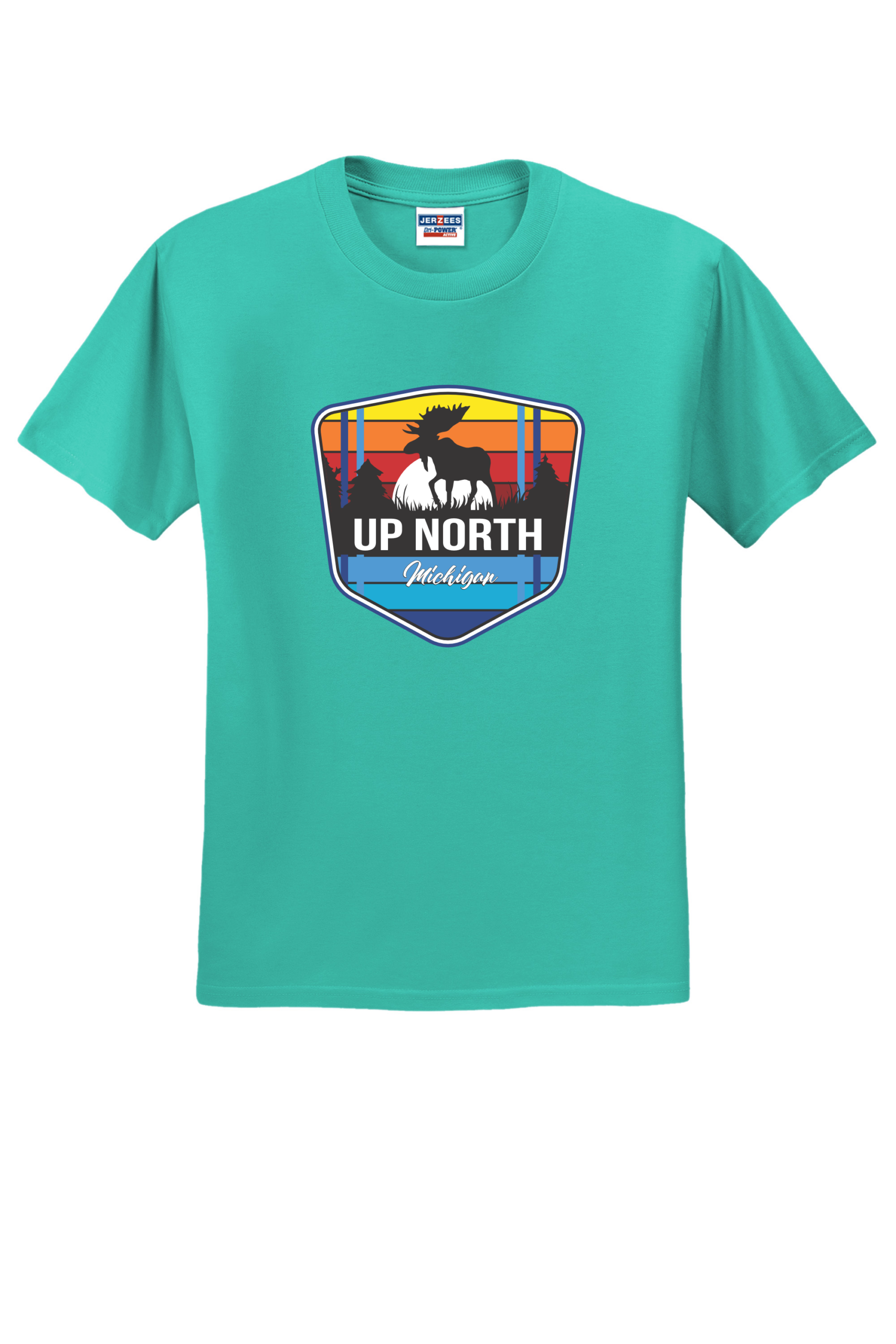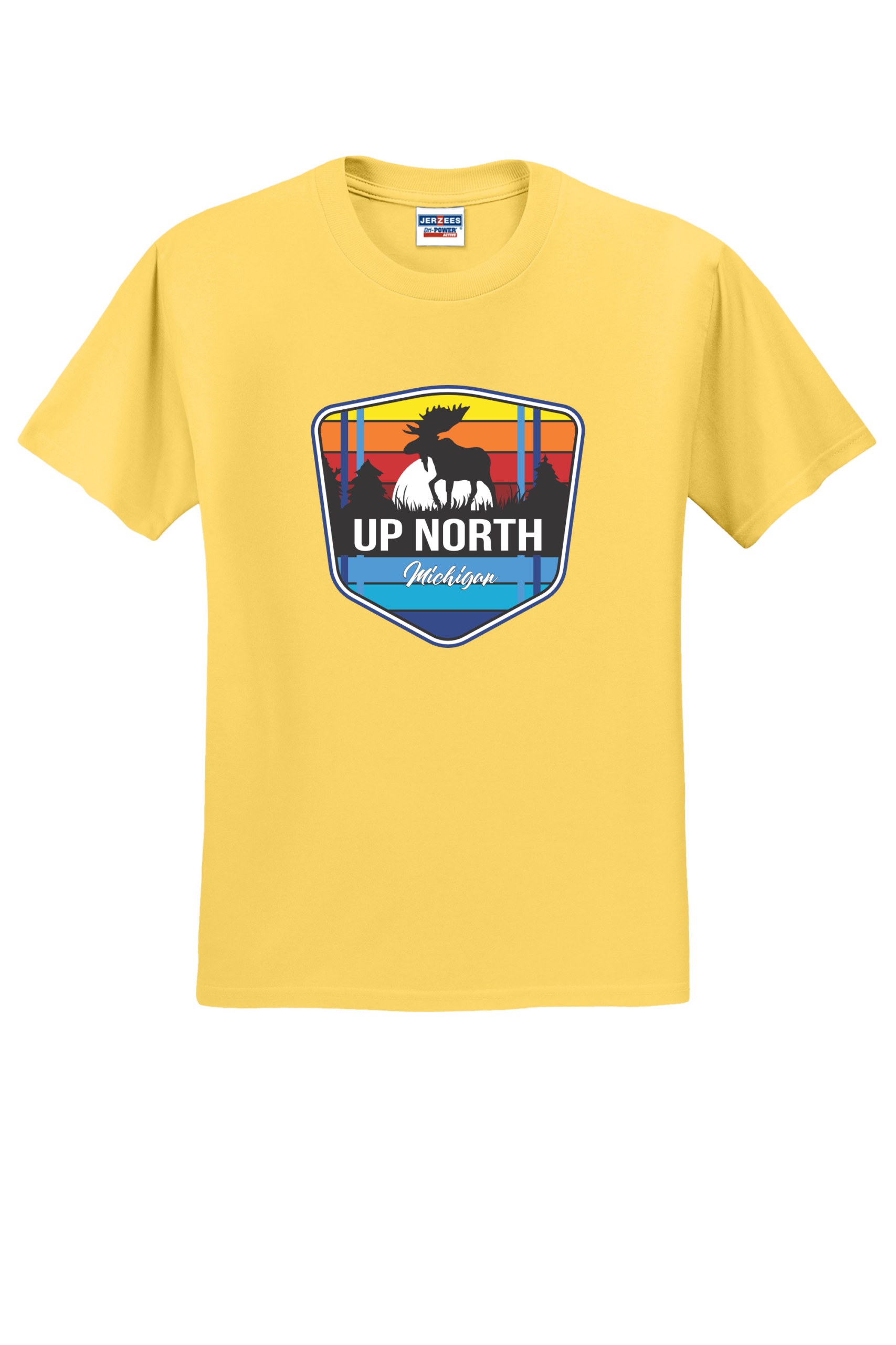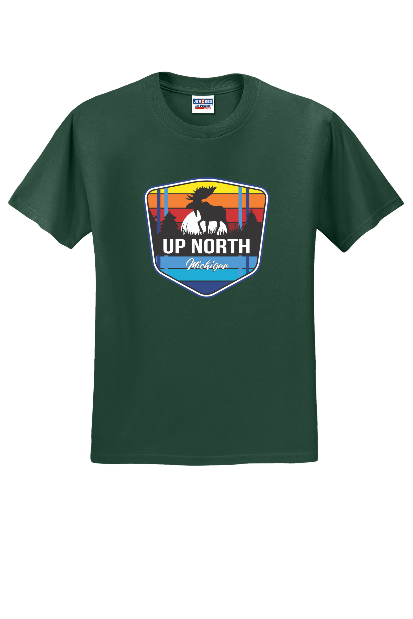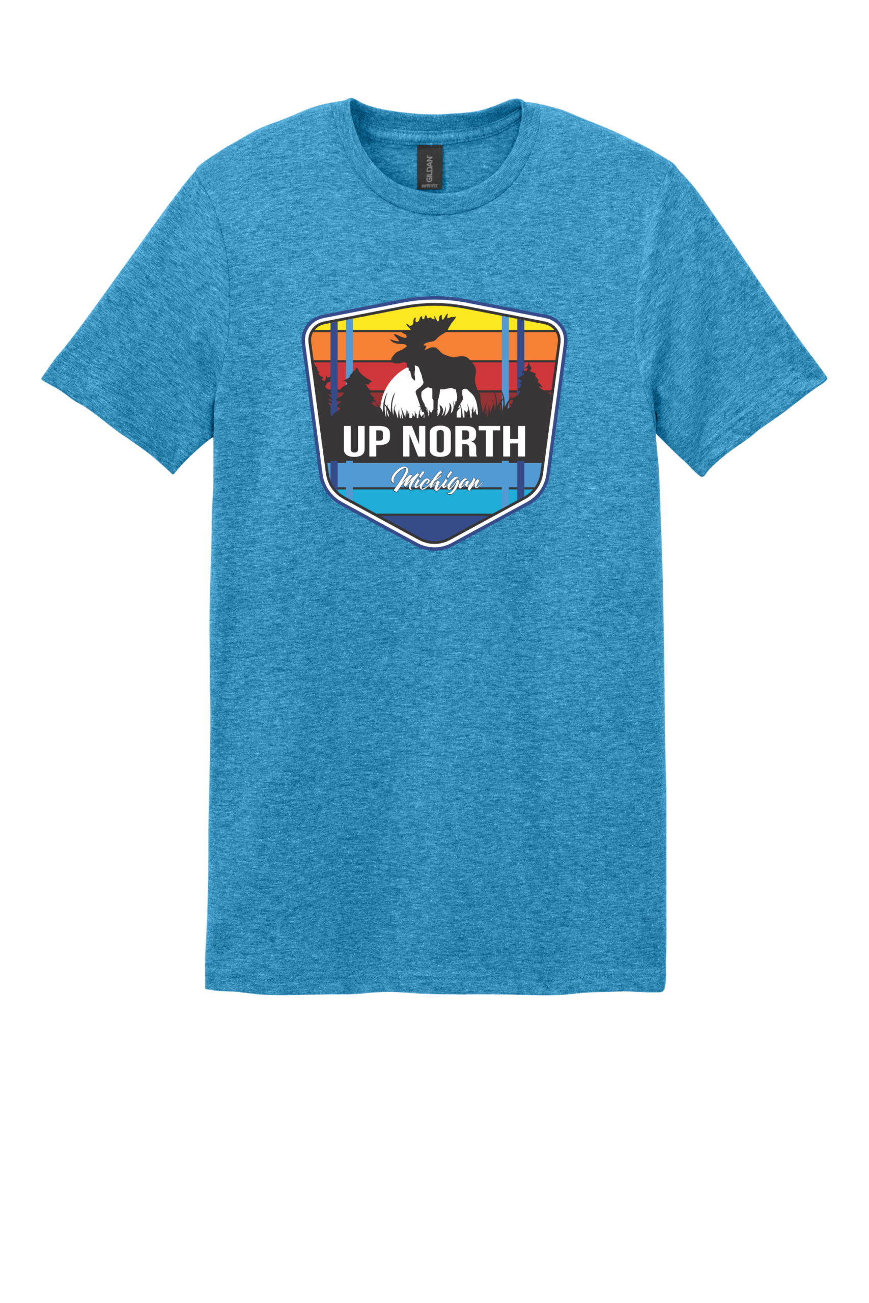 Celebrate Michigan’s wild north with our Up North Moose tee. This vibrant design features a moose silhouette framed by retro sunset stripes and a pine forest backdrop, capturing the beauty and adventure of Northern Michigan. Printed on a premium Jerzees 50/50 shirt for comfort, durability, and everyday wear. Perfect for nature lovers, campers, and anyone who calls “Up North” their happy place. Made from a perfect blend of cotton and polyester, this tee combines comfort and durability with a vibrant, long-lasting print. This shirt ensures your design stands out with brilliant colors and sharp details, making it ideal for any occasion. Make a statement with a T-shirt that’s as stylish as it is comfortable.