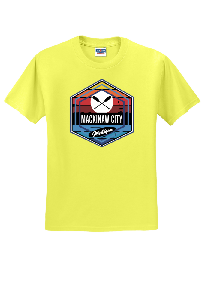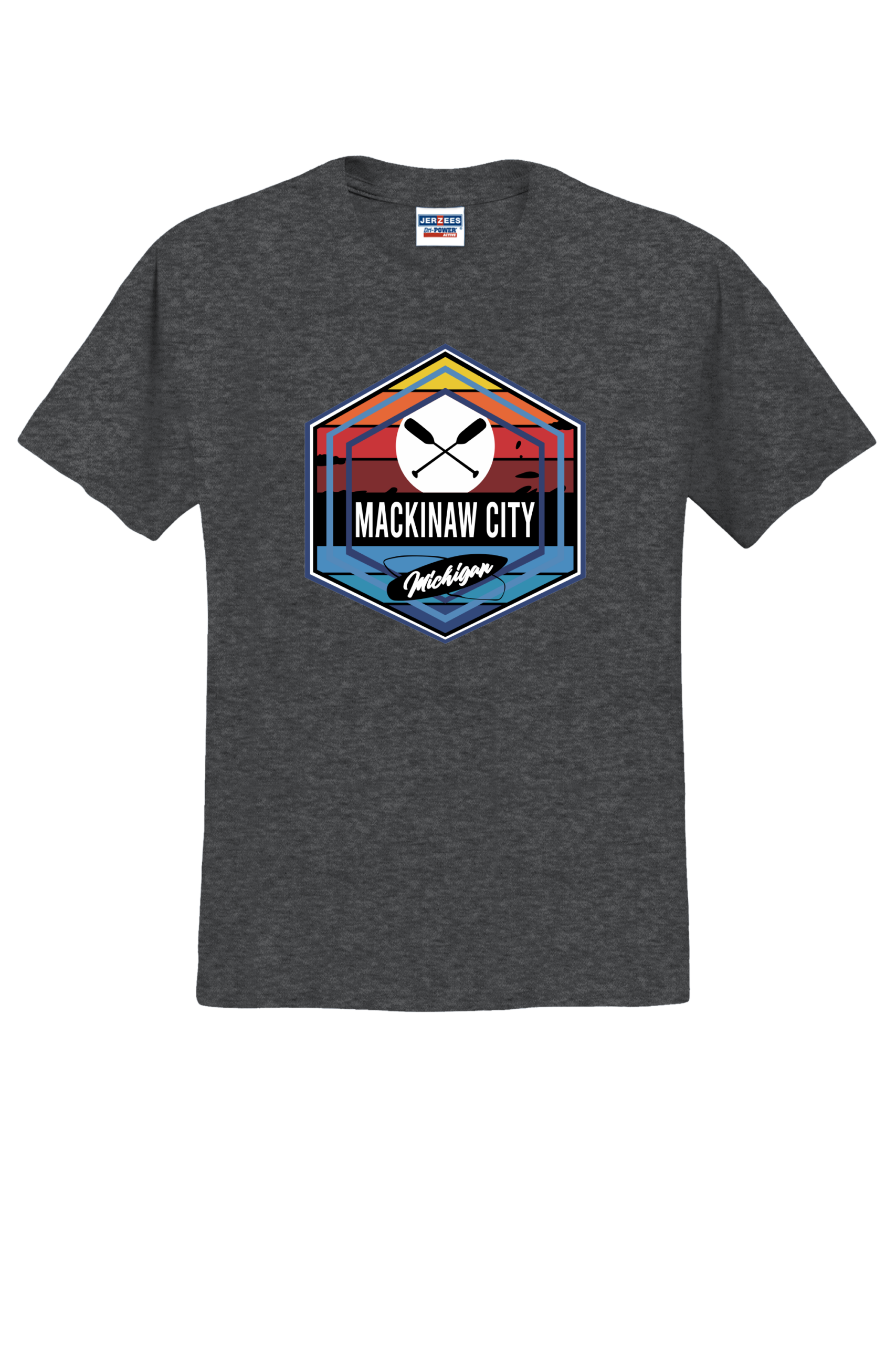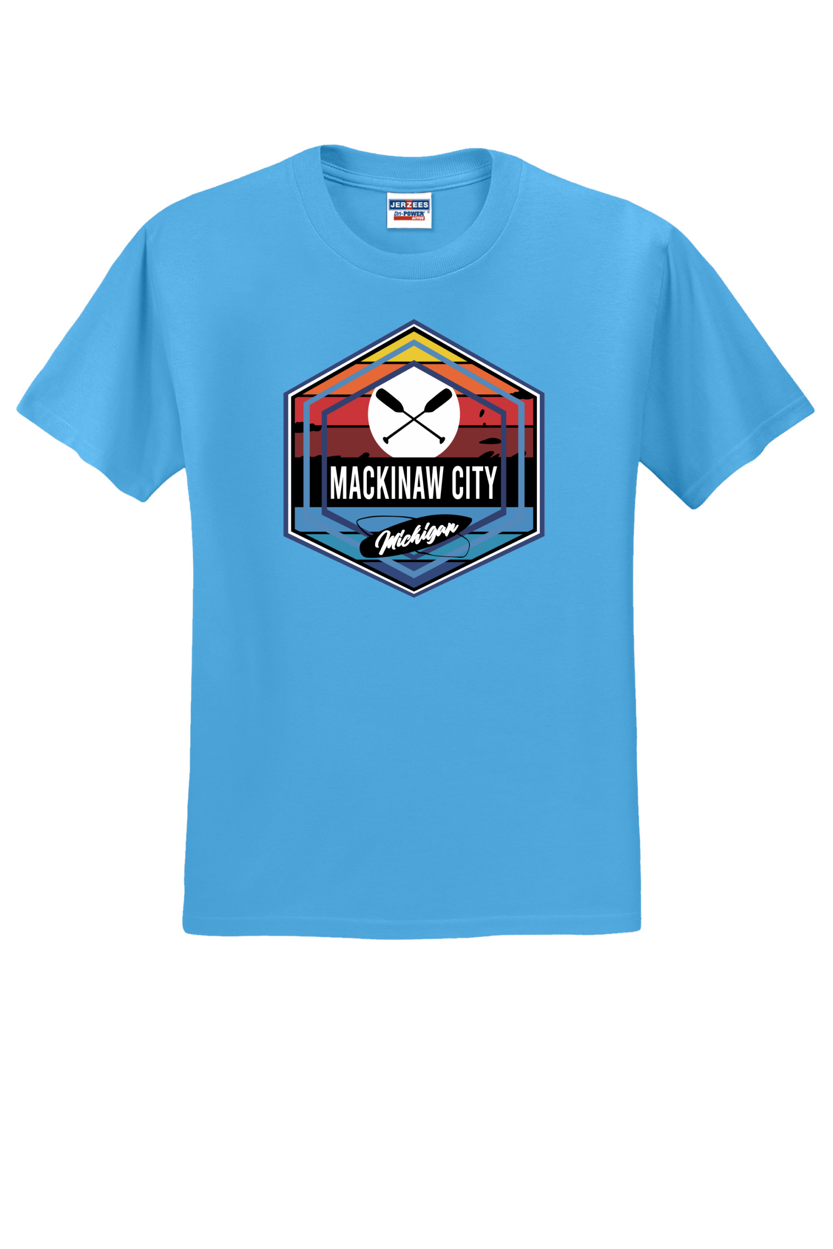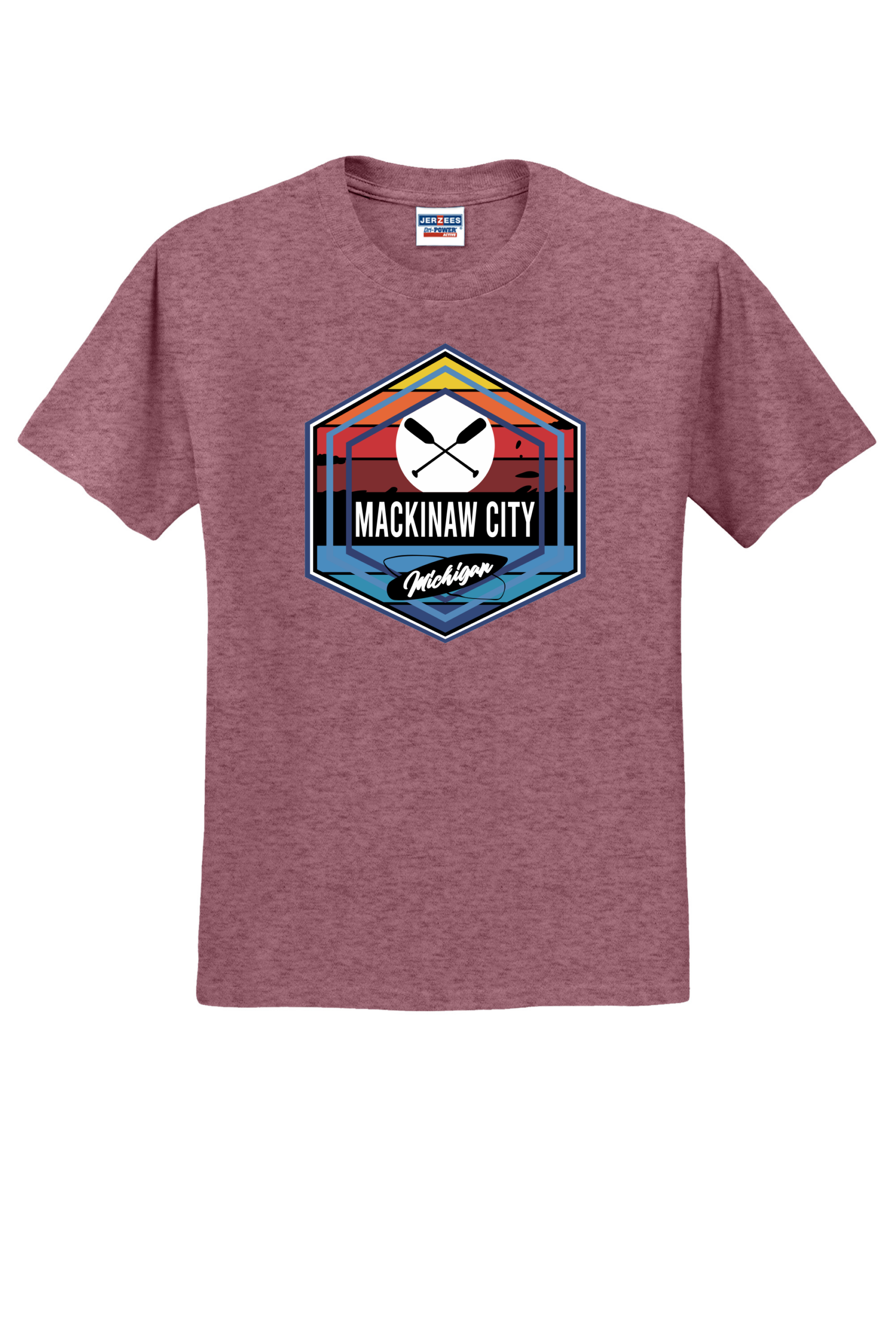 Capture the energy of Northern Michigan with our Mackinaw City Paddles Sunset tee. Featuring crossed paddles, vibrant vintage-style sunset stripes, and a clean hexagon badge layout, this design celebrates outdoor adventures around the Straits. Printed on a premium Jerzees 50/50 blend for comfort and durability, it’s perfect for kayaking, sightseeing, beach walks, and everyday Mackinaw lovers. Made from a perfect blend of cotton and polyester, this tee combines comfort and durability with a vibrant, long-lasting print. This shirt ensures your design stands out with brilliant colors and sharp details, making it ideal for any occasion. Make a statement with a T-shirt that’s as stylish as it is comfortable.
